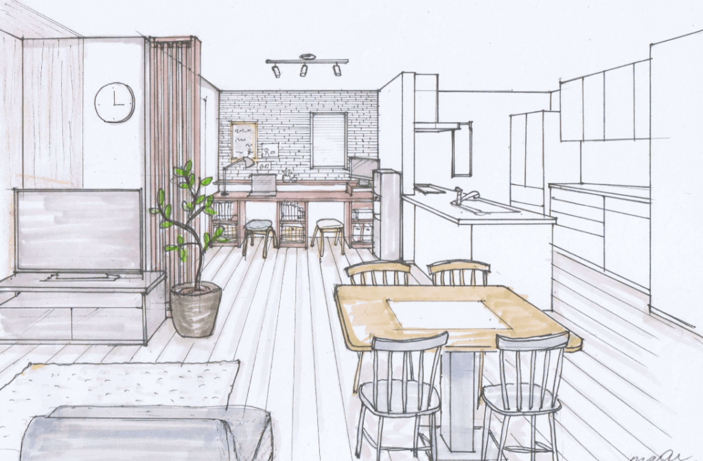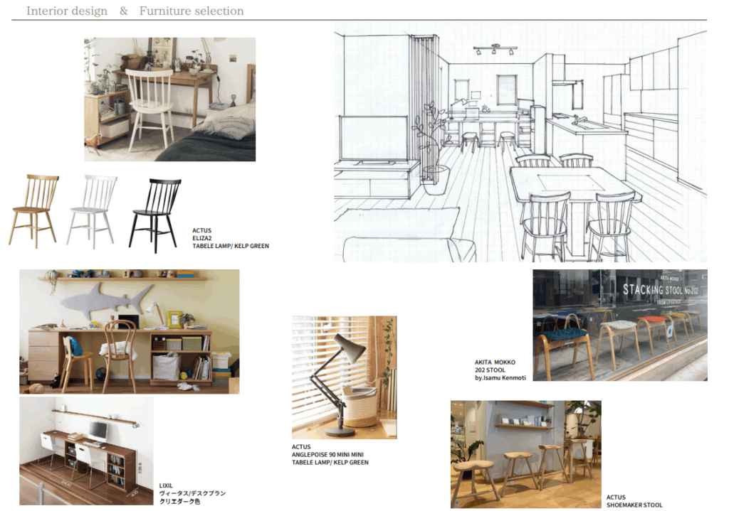 ↑計画のイメージをスケッチしてご提案。インテリアの具体的な商品もご紹介しました。